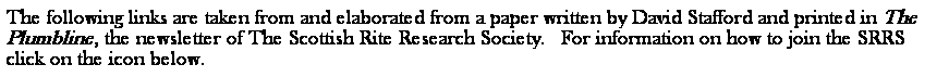 Text Box: The following links are taken from and elaborated from a paper written by David Stafford and printed in The Plumbline, the newsletter of The Scottish Rite Research Society.  For information on how to join the SRRS click on the icon below.